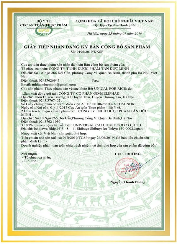 CANXI CƠM UNICAL FOR RICE CHỊU TRÁCH NHIỆM PHÂN PHỐI BỞI CÔNG TY TNHH DƯỢC PHẨM TÂN ĐỨC MINH